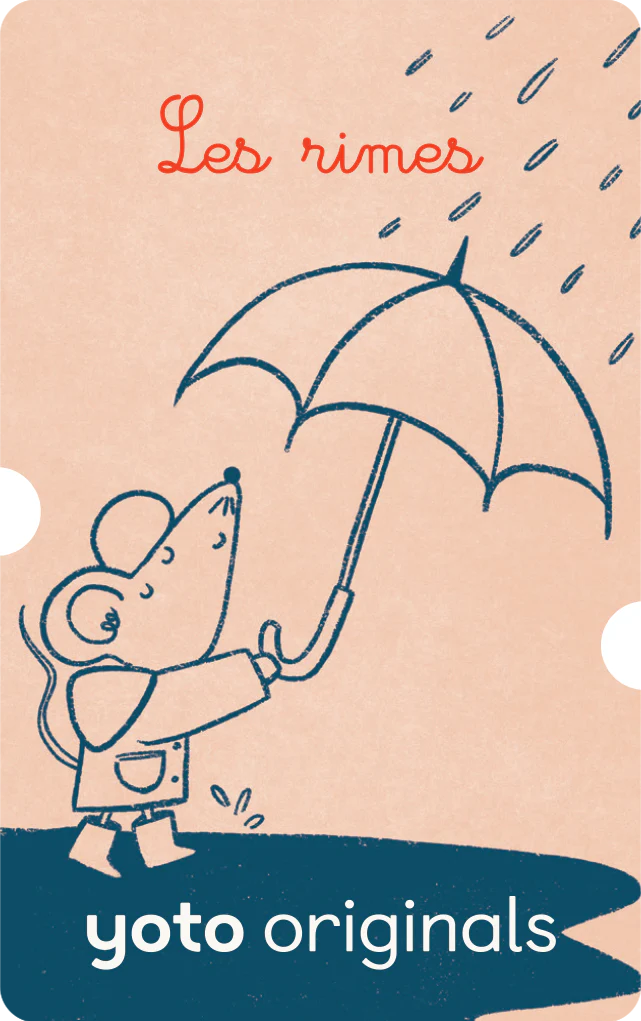- Les rimes - Cette carte va permettre à votre enfant d’isoler le dernier son dans un mot et d’identifier des sons qui riment entre eux. Les rimes sont importantes car elles mettent en valeur des sons qui sont particulièrement reconnaissables à l’oreille. En s’entrainant à reconnaitre des sons identiques, et en puisant dans son vocabulaire pour trouver des mots qui riment, votre enfant se prépare à apprendre à lire.